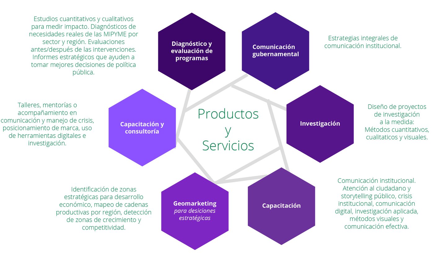 Somos tus aliados estratégicos para la innovación, análisis y comunicación efectiva. A través de metodologías integrales -visuales, cuantitativas, cualitativas y geoespaciales— contribuimos a mejorar la toma de decisiones, fortalecer la difusión de programas, profesionalizar a las empresas participantes y generar resultados medibles. Esto incrmenta el impacto de la labor de las instituciones y les permite optimizar recursos y avanzar hacia sus objetivos de desarrollo económico con mayor precisión, claridad y alcance.